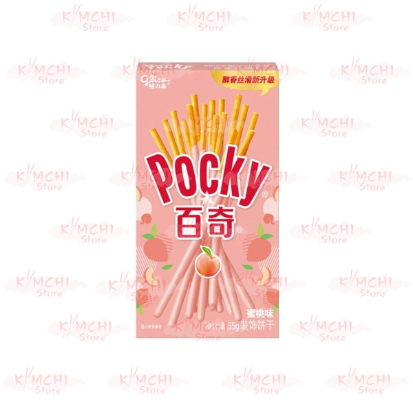 Ce sont des fameux gâteaux au Japon. Ils sont fabriqués par la marque Glico. Les Pockys sont des bâtons à base de lait entier et de beurre de cacao entouré par des saveurs. Ce produit est de saveur Pêche, pour les plus gourmands !